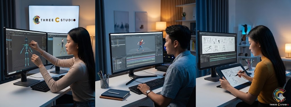 - Diễn hoạt (Animation): Đây là giai đoạn thổi hồn vào nhân vật. Các họa sĩ 3D tại Three C Studio đã dành hàng trăm giờ để tinh chỉnh từng cú máy và chuyển động.
