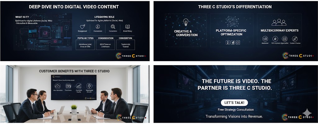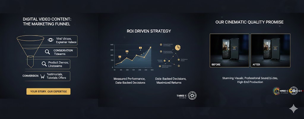 Hiểu rõ tầm quan trọng “sống còn” này, Three C Studio – đơn vị với kinh nghiệm vững chắc trong lĩnh vực truyền thông và sáng tạo – chính thức công bố triển khai dịch vụ Digital Video Content chuyên nghiệp, toàn diện. Chúng tôi cam kết cung cấp giải pháp sản xuất Video chất lượng cao, có chiến lược rõ ràng, giúp Video của bạn không chỉ đẹp mà còn phải tạo ra giá trị chuyển đổi thực tế, trở thành chìa khóa tăng trưởng (Growth Hacking) bền vững cho mọi doanh nghiệp.