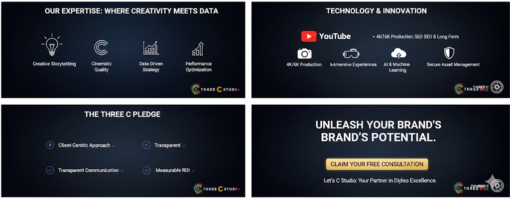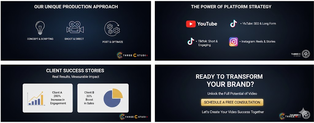 Three C Studio tự hào là đối tác chiến lược, giúp doanh nghiệp biến Video thành công cụ truyền thông và kiếm tiền mạnh mẽ nhất. Với quy trình chuyên nghiệp, đội ngũ sáng tạo và cam kết về hiệu quả chuyển đổi, chúng tôi đảm bảo Video của bạn sẽ đạt được mục tiêu kinh doanh đã đề ra.