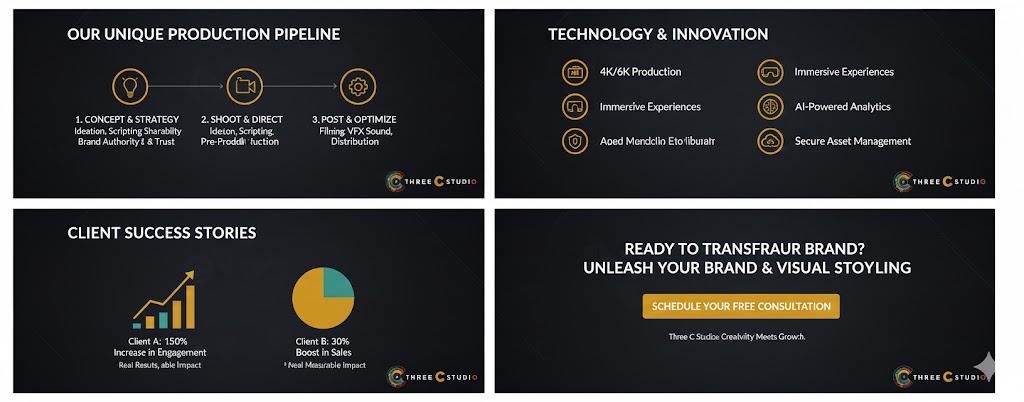 Three C Studio tự hào là đối tác chiến lược, nơi chất lượng sản xuất TVC cao cấp hòa quyện với khả năng sáng tạo Viral Clip đột phá. Chúng tôi cam kết mang đến những giải pháp Video Content không chỉ mãn nhãn mà còn mang lại hiệu quả kinh doanh đo lường được.