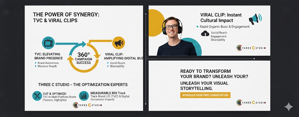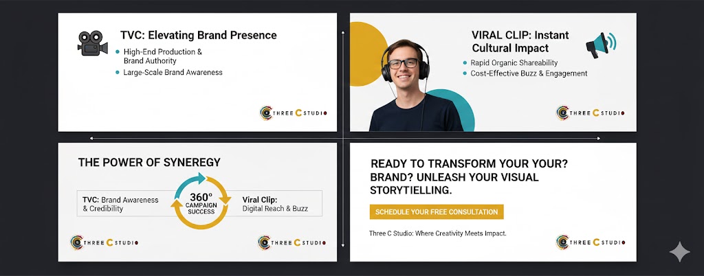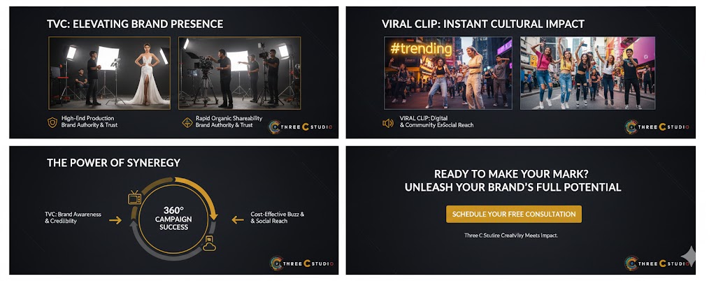 Nhận thức rõ tầm quan trọng và sức mạnh cộng hưởng của hai loại hình này, Three C Studio – đơn vị hàng đầu trong lĩnh vực truyền thông và sáng tạo – tự hào mang đến dịch vụ sản xuất TVC & Viral Clip trọn gói, kết hợp giữa chất lượng điện ảnh đỉnh cao và chiến lược Digital Marketing thông minh. Chúng tôi không chỉ làm Video; chúng tôi tạo ra hiệu ứng truyền thông đo lường được, giúp thương hiệu của bạn không chỉ được biết đến mà còn được yêu mến và chia sẻ rộng rãi.